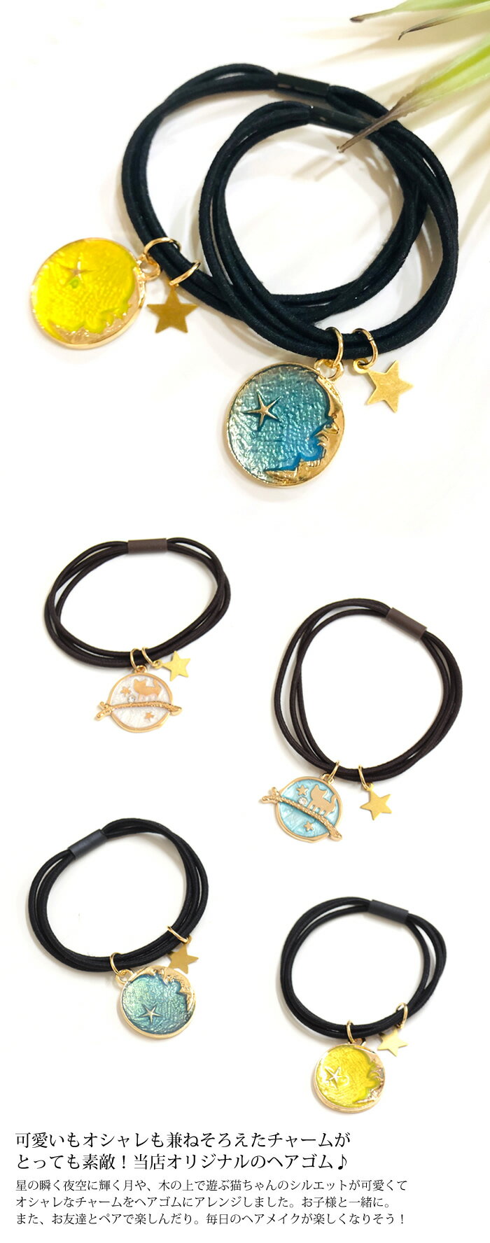 星の瞬く夜空に輝く月や、木の上で遊ぶ猫ちゃんのシルエットが可愛くて オシャレなチャームをヘアゴムにアレンジしました。