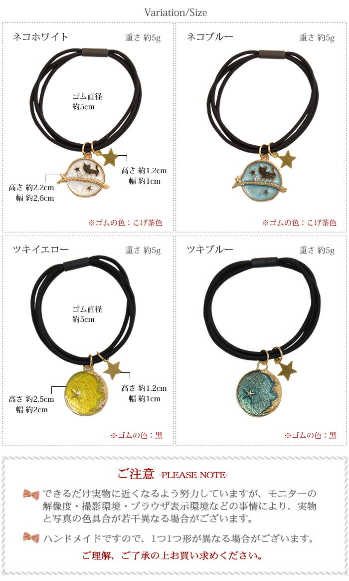 毎日のヘアメイクが楽しくなりそう! サイズ 【ネコホワイト ・ ネコブルー】 ゴム直径 約5cm (モチーフ:ネコ)約高さ2.2×幅2.6cm (モチーフ:星)約高さ1.2×幅1cm 【ツキイエロー ・ツキブルー 】 ゴム直径 約5cm (モチーフ:ツキ) 約高さ2.5×幅2cm (モチーフ:星)約高さ1.2×幅1cm 重さ (全共通) 約5g ご注意 ※できるだけ実物に近くなるよう努力していますが、モニターの解像度・撮影環境・ブラウザ表示環境などの事情により、実物と写真の色具合が若干異なる場合がございます。