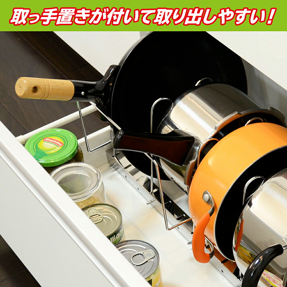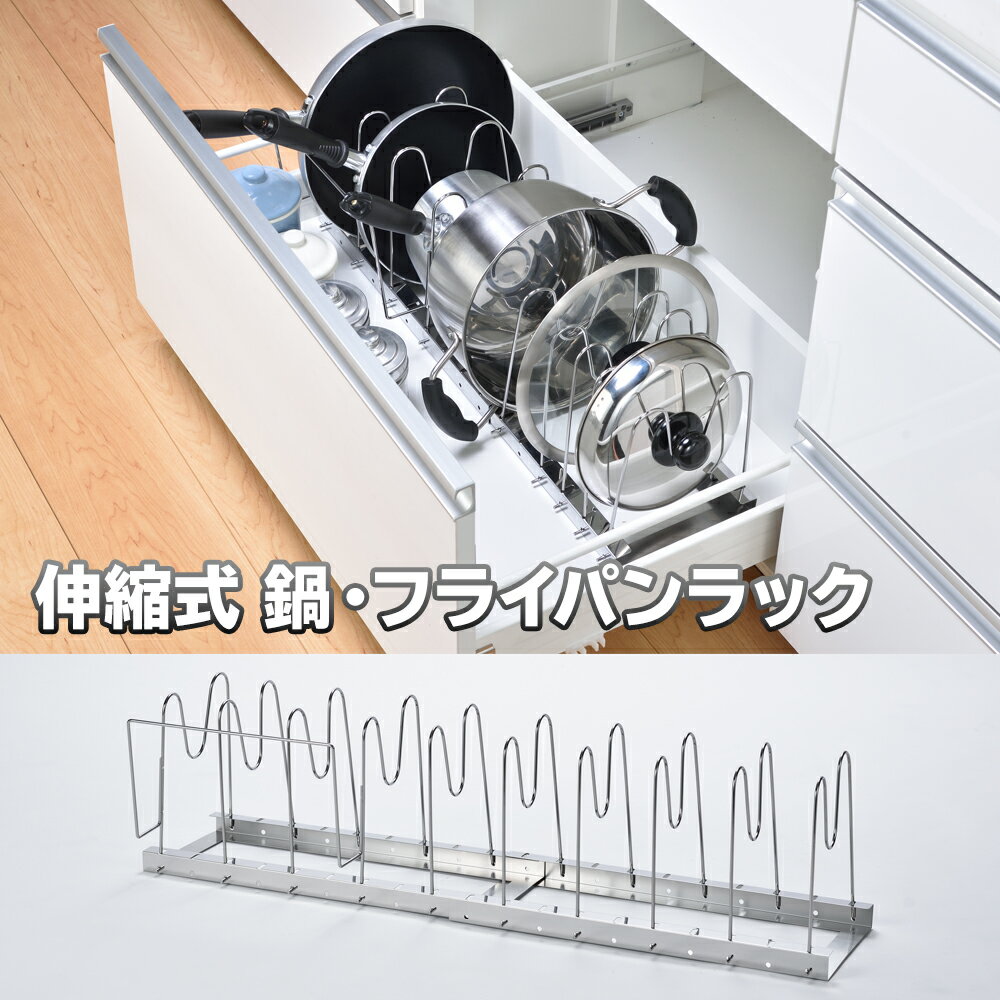商品名 伸縮式鍋・フライパンラック サイズ 約 幅44〜76 × 奥行22 × 高さ20cm 重 量 約 1kg 材 質 本体:ステンレススチール仕切りパーツ:スチール(表面加工:クロムメッキ) 備 考 ※鍋やフライパン等は付属しません。
